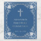 This elegant blue and silver religious design with a vintage air, recommended for a boy, has an ornate faux silver foil frame with elegant baroque decorations on a classic blue background. Above the text there is a religious cross in faux silver foil. The occasion is also in faux silver; the rest of the text has a silvery grey colour similar to the faux silver frame.