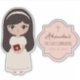 A flat cartoon drawing of a cute brunette girl with long hair and big black eyes, in a white dress, with a bible in hand, ready for first communion. To her right, there is a pink fancy frame with text in it. The name is written in brown handwriting script, the occasion in brown hand letters. Above the text, in the upper part of the frame, there is a pink cross,