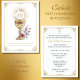 Featuring our traditional Catholic First Holy Communion invitation with the Holy Eucharist, gold chalice, and white dove accented with pink florals. On the front is a scripture quote.