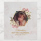 This elegant floral geometric religious design has a replaceable girl photo in an irregular gold frame from two gold hexagons that overlay, with a gold cross at its top and with flower bouquets of pink and white orchids on the frame, up right and down left. Under the frame, the name is written in an elegant calligraphic script, the rest in caps. All text is golden. The background is white marble.