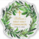 This botanical , gender neutral design for a first communion has a foliage frame of green leaves. Inside the greenery frame, above the text, there is a faux gold foil cross. The name and occasion are golden, the date is black. The name is written in an elegant calligraphic script.