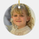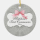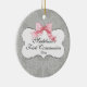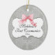 This First Communion Commemorative ornament features elegant French copperplate swirls, black, pink and green dots in the background and a beautiful hand painted pink bow. All made from original artwork by Audrey Jeanne Roberts. The result is a beautifully contemporary gift. On the reverse side there is the same dot pattern on a white background and a bracket revealing a place for your child's photo. You can easily add your own picture or change the message. YOU MIGHT ALSO ENJOY: