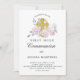 Very pretty First Communion invitation features a gold cross surrounded by blush pink roses and sage green leaves. Traditional fonts give this invitation a classic appearance.