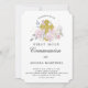 Very pretty First Communion invitation features a gold cross surrounded by blush pink roses and sage green leaves. Traditional fonts give this invitation a classic appearance.