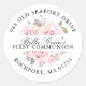 Add a special touch to all your First Communion invitation envelopes with this elegant round design. It features a bouquet of blush pink roses and white peonies in the center. Sage green leaves give it a rustic botanical vibe. Your name and First Communion are written across the center on a white strip. Your address is added in curved text above and below the rose bouquet.