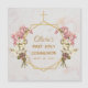 This modern, elegant floral first holy communion magnet has a geometric irregular gold frame with flower bouquets of white and pink orchids on the left and right sides over two gold hexagons that overlay over a white marble background, with a gold cross at its top. The name of the child is written in an elegant calligraphic script; the rest is written in smaller caps. All text has a golden yellow colour, like the gold frame.