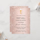 A rose gold faux metallic looking background. Decorated with rose gold, pink faux glitter, sparkels, a chalice and a host. Personalise and add a name and details. The name is written with a hand lettered style script