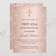 A rose gold faux metallic looking background. Decorated with rose gold, pink faux glitter dust and a cross. Personalise and add a name and details. The name is written with a hand lettered style script