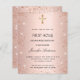 A rose gold background. Decorated with rose gold, pink faux sparkles and a golden cross. Personalise and add a name and details. The name is written with a hand lettered style script