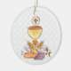 A lovely ornament to commemorate a First Holy Communion. The design features a chalice, Eucharist with cross, grapes, bread, wheat and flowers on a faux white lace background, which can be removed if desired. The back can be customised with name, date and other sentiment.