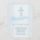 A blue and white baptism invitation with a decorative cross and the word "baptism" in calligraphy. (Pix). <br/><br/>The card is easy to customise with your wording, font, font colour and choice of six paper types.<br/><br/>Not exactly what you're looking for? All our products can be custom designed to meet your needs at no extra charge.<br/><br/>Simply contact us at askcottonlamb@gmail.com<br/><br/>Coordinating products available: