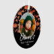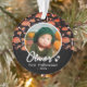 First Halloween Orange Mushroom Fall Photo Ornament. Lovely orange and black mushroom pattern in fall colours, a custom baby's name in a trendy script. Personalise the ornament with your baby's photo, name and year. A lovely Halloween holiday keepsake.