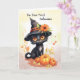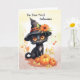 A very first Halloween is so special! Send this heartwarming card to celebrate with this adorable black cat with enchanting eyes. It is wearing a black hat with an orange daisy. Pumkpins are at the feet of this cute cat. Enjoy the magic of the season as you celebrate a very first Halloween! Purr-fect for a little boy or girl!
