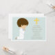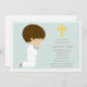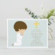 Blue First Holy Communion invitation featuring a kneeling brunette boy on the left, yellow cross with Communion or party details on the right in brown.