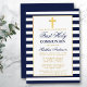 Elegant First Holy Communion Invitation with Cross. Blue and White Stripes. Gold Cross.