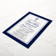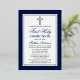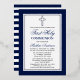 Elegant Navy Blue and Gold First Holy Communion Invitation with Cross. Silver Foil Frame. Silver Foil Cross. Striped Back.