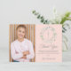 A decorative laurel garland, silver rings and cross sit above your special first holy communion thank you message and besides your own photo on a blush pink background. The reverse features a matching laurel garland, silver rings and cross. Designed by Thisisnotme©