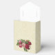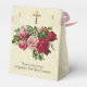 This is a lovely favour box for First Holy Communion. It has a beautiful spray of red and pink roses with lilies of the valley. There is a gold crucifix on the back of the box. The background is an ecru lace design. All texts and fonts can be customised.