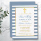 Elegant First Holy Communion Invitation with Cross. Dusty Blue and White Stripes. Gold Cross.