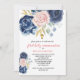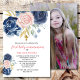 This elegant first holy communion invitation displays an photo in back, floral navy blue and blush pink and a gold cross. You can also bundle up with matching stationery and coordinating paper goods to go with. Napkins, plates, thank you cards and more. See Navy blue/blush pink themed collection. Everything you need to create an elegant event.
