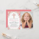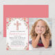 Elegant first holy communion invitation featuring a simple white background that can be changed to any colour, a photo of your child, a pretty watercolor floral religious cross, gold confetti glitter, and a modern template that is easy to personalise.