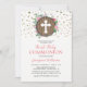 Rustic first holy communion invitation featuring a simple white background that can be changed to any colour, a rustic wooden barrel, a pink rose floral design, gold sparkly glitter, and a modern religious communion template that is easy to personalise.