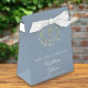 Elegant floral first holy communion favour box featuring a pretty laurel greenery garland and gold cross with personalised name and special date set in chic gold typography on a dusty blue background. You can also personalise with your own thank you message under the lid. A perfect way to say thank you to your guests! Designed by Thisisnotme©