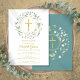 A decorative greenery garland and gold cross sit above your special first holy communion invitation information on this elegant design.