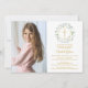 A decorative greenery garland and gold cross sit above your special first holy communion invitation information, complementing your special photo on this elegant design. The reverse features a matching laurel garland and cross. Designed by Thisisnotme©