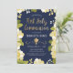 This modern and pretty First Holy Communion invitation features an illustrated floral border and the words "First Holy Communion" in gold. The background is a navy blue colour, but can be customised to any colour you choose. The back of the invite includes a gold quatrefoil pattern with a matching blue background that can also be swapped out. The text is customisable for your special religious event.