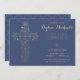 This modern first holy communion invitation features an intricate "gold foil" style cross and the words "First Holy Communion" in a modern font. The background is navy blue, but can be customised to any colour of your choice.