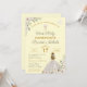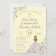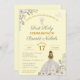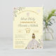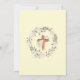 Stunning First Holy Communion floral invitations featuring rustic, vintage inspired elements with girl in traditional white dress, against a soft yellow background. The back of the invitation features a boho style cross with watercolor flowers and greenery. Swap out 'First Holy Communion' for 'Christening' or 'Baptism' whichever suits your special event.