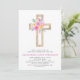 Pastel Pink, Orange and Purple Floral Rose Flowers Cross Botanical Watercolor Religious First (1st) Holy Communion Invitations.