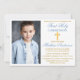 Modern Elegant Dusty Blue and Gold First Holy Communion Invitation with Cross and Photo.