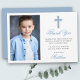 Elegant First Holy Communion Thank You Card with Silver Cross. Photo Front. Light Blue Script.