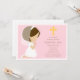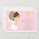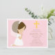 Pink First Holy Communion invitation featuring a kneeling brunette girl on the left, yellow cross with Communion or party details on the right in brown.