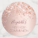 A rose gold background decorated with rose gold confetti. Personalise and add a date and name/event. Dark rose gold coloured letters.   Some confetti chips with name and date, others with a cross.  Add your own photo on two of the chips.