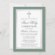 Modern Elegant Sage Green and Silver First Holy Communion Invitation with Cross. Photo Back.