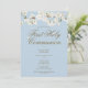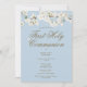 An elegant first holy communion invitation featuring delicate white blossom framing your first holy communion details in elegant gold typography on a dusty blue background and your special photo on the reverse. Designed by Thisisnotme©