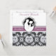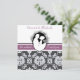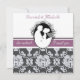 Our First Kiss customised wedding invitation features a newlywed husband and wife about to engage in their first kiss. A grey and white damask background with a purple band and text that reads "he asked...I said yes" and areas you can add your wedding ceremonye and reception details on a fully customisable classy and unique wedding invitation.