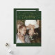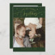 Minimal and elegant holiday card for the newlyweds celebrating their first Christmas together as husband and wife featuring a text that says "our first married Christmas" with dots and hearts. The background is green.