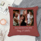 Personalise a unique keepsake for a new mum celebrating her first Mother's Day with this terracotta three photo collage throw pillow. Pillow design features three photo placements in panel form with modern typography and elegant script and two red hearts. Perfect photo keepsake for mum's celebrating their first Mother's Day.
