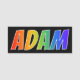 This fun, vibrant, multicolored name tag design features the common first name "ADAM", with the letters of the name having a colourful rainbow spectrum like gradient colouring pattern, on a black coloured background. A nametag like this might be worn by an employee, a staff member, or a customer service representative whose given name is Adam, to help identify the wearer to customers or other people. [~Z0000344]