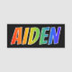 This fun, vibrant, multicolored name tag design features the common first name "AIDEN", with the letters of the name having a colourful rainbow spectrum like gradient colouring pattern, on a black coloured background. A nametag like this might be worn by a customer service representative, a volunteer, or a staff member named Aiden, to help identify the wearer to customers or other people. [~Z0000344]