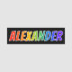 This fun, vibrant, multicolored name tag design features the common first name "ALEXANDER", with the letters of the name having a colourful rainbow spectrum like gradient colouring pattern, on a black coloured background. A nametag like this might be worn by an employee, a volunteer, or a customer service representative whose given name is Alexander, to help identify the wearer to others. [~Z0000344]