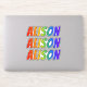 This multicolored, fun, and vibrant sticker design features the common first name or given name "ALISON", with the letters of the name featuring a colourful rainbow spectrum inspired gradient colouring pattern. It might be a fun present to give to somebody whose given name is Alison. [~Z0000361]