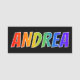 This fun, vibrant, multicolored name tag design features the common first name "ANDREA", with the letters of the name having a colourful rainbow spectrum like gradient colouring pattern, on a black coloured background. A nametag like this might be worn by a staff member, an employee, or a customer service representative who is named Andrea, to help identify the wearer to others. [~Z0000344]