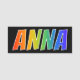 This fun, vibrant, multicolored name tag design features the common first name "ANNA", with the letters of the name having a colourful rainbow spectrum like gradient colouring pattern, on a black coloured background. A nametag like this might be worn by a volunteer, a customer service representative, or an employee whose name is Anna, to help identify the wearer to others. [~Z0000344]