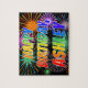 This exciting, vibrant, birthday-themed jigsaw puzzle design features the message "HAPPY BIRTHDAY, ASHLEY" having a colourful rainbow spectrum inspired gradient pattern, and a lively bursting celebratory fireworks inspired background pattern. A colourful puzzle like this might be used to send a birthday greeting message to somebody named Ashley. [~Z0000465]