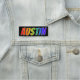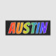 This fun, vibrant, multicolored name tag design features the common first name "AUSTIN", with the letters of the name having a colourful rainbow spectrum like gradient colouring pattern, on a black coloured background. A nametag like this might be worn by a staff member, a volunteer, or an employee whose first name is Austin, to help identify the wearer to others. [~Z0000344]